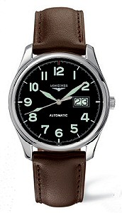 Longines Avigation watch with "Grande Date" calendar from Longines Heritage Collection. Swiss Automatic ETA movement. Polished Stainless steel case. Black color dial with luminous large Arabic numerals and "Grande Guichet" large date calendar. Brown leather watch band. Water resistance 30m