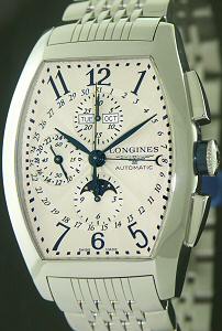 Longines Moon Phase chronograph watch from Longines Evidenza Collection. Swiss 25 jewels Valjoux 7750 based movement, tonneau-shape stainless steel case and watch bracelet with deployant clasp, ivory Guilloche dial and blued hands. Day-of-the-week, month and moon-phase indicator. Pointer-type date calendar. Chronograph.