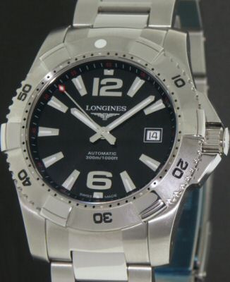 Longines Hydro Conquest L3.649.4.56.6 Swiss ETA based Longines caliber L633 automatic dive watch. Robust yet elegant Solid Stainless Steel case and bracelet are a combination satin and high polish finish. Bold, black dial with luminous filled hands and markers. This handsome watch is also water resistant to 300m and has an anti-glare treated Sapphire crystal. Unidirectional rotating elapsed time rotating bezel. Elegance meets Sport.