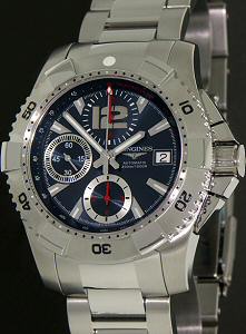 Longines Hydroconquest self-winding chronograph watch with date calendar. Blue dial with superluminova coating on hands and markers, stainless steel case and bracelet with 0-60 rotating bezel and sapphire crystal. Water resistant to 300 meters.