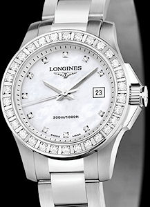 Longines Conquest ladies diver, model L3.258.0.89.6. Elegant, satin and polish finished case with diamonds around bezel. White Mother-of-Pearl dial with diamond markers. Sapphire crystal. Water resistant to 300m.