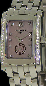 Longines Dolce Vita, L5.155.0.93.6. Quartz analog movement, sapphire crystal, stainless steel case and watch bracelet. Diamonds on the bezel. Pink Mother of pearl dial, diamond markers and a small heart with diamonds inside at 12 o`clock position.