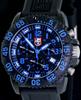 Luminox EVO Navy SEAL Colormark Series dive watch with chronograph. Model 3083. Black dial, easy-to-read deep blue Arabic numerals on the dial and the bezel. Micro gas tubes light the hands, hour markers, and even a dot on the black unidirectional rotating bezel. The case is lightweight black color fiberglass reinforced polyester injected material. The watch comes on a polyurethane strap and is 200 meters water resistant.