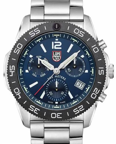Luminox Pacific Diver model 3144. Quartz analog movement with chronograph and date function. Stainless steel case and bracelet. Blue dial. Uni-directional bezel with 60 minute scale. Tritium gas tube filled hands and markers. Scratch resistant sapphire crystal. Water resistant to 200 meters.