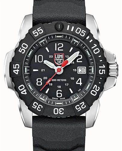 Luminox Navy SEAL model 3251.CB. Swiss made quartz analog movement. Stainless steel case. Black dial with Arabic numerals. Tritium gas tube filled hands and markers. Uni-directional rotating bezel with 0-60 scale. Scratch resistant sapphire crystal. Black rubber strap with tang style buckle. Water resistant to 200 meters.
