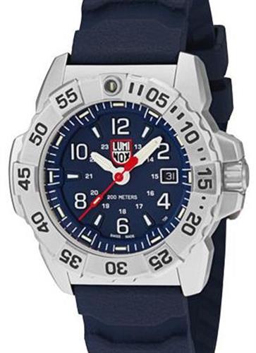 Luminox Navy SEAL model 3253. Swiss made quartz analog movement. Stainless steel case with combination finish. Blue dial with Arabic numerals. Tritium gas tube filled hands and markers. Uni-directional rotating bezel with 0-60 scale. Scratch resistant sapphire crystal. Blue rubber strap with tang style buckle. Water resistant to 200 meters.