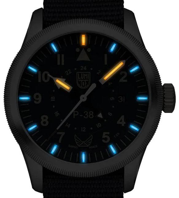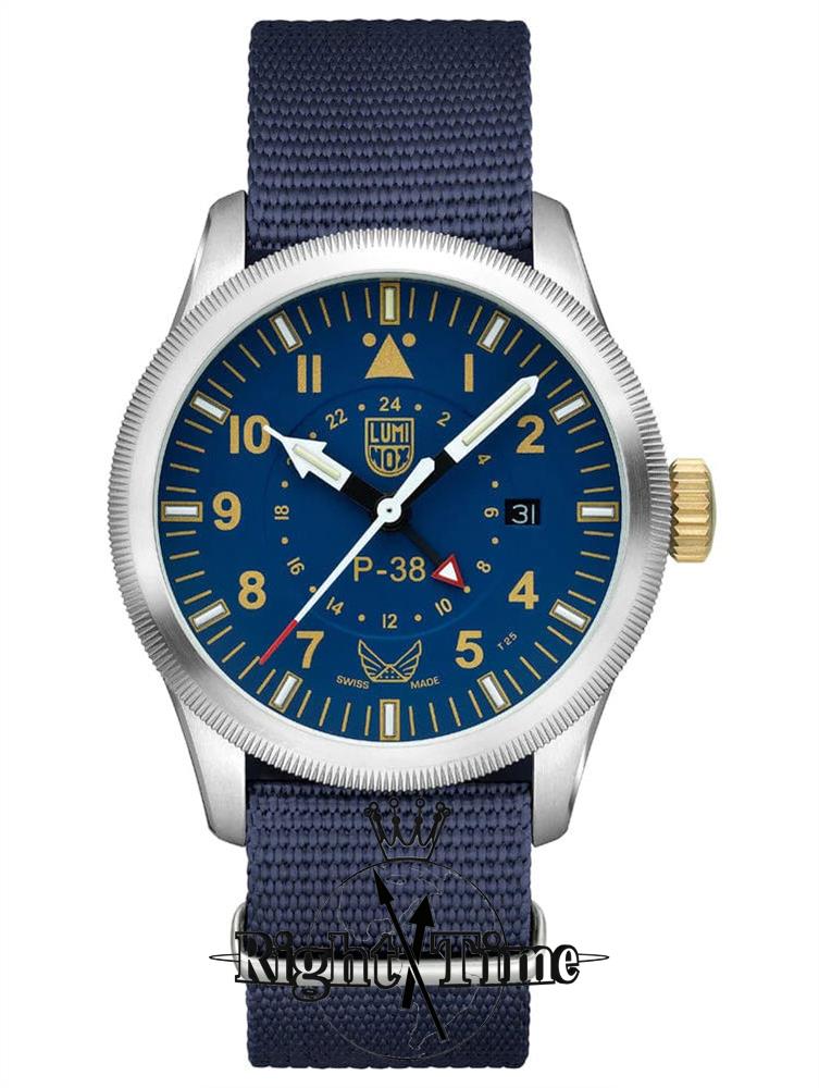 Luminox P-38 Lightning The Guardian model 9521.VOL. Collaboration with Volition America. Solid stainless steel case with a coin edge stationary bezel. Blue dial with gold tone Arabic numerals and accents. Swiss made quartz movement with date window and GMT hand. A/R coated sapphire crystal.