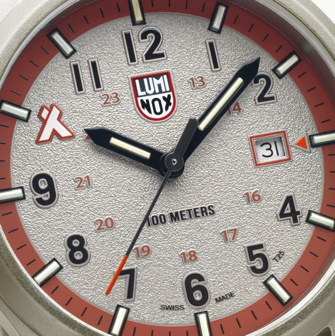 Arabic applied numerals. Luminocity by self-powered tritium filled (3H) micro gas tubes markers. Sand color. Bear Grylls iconic logo at 10 o'clock.
