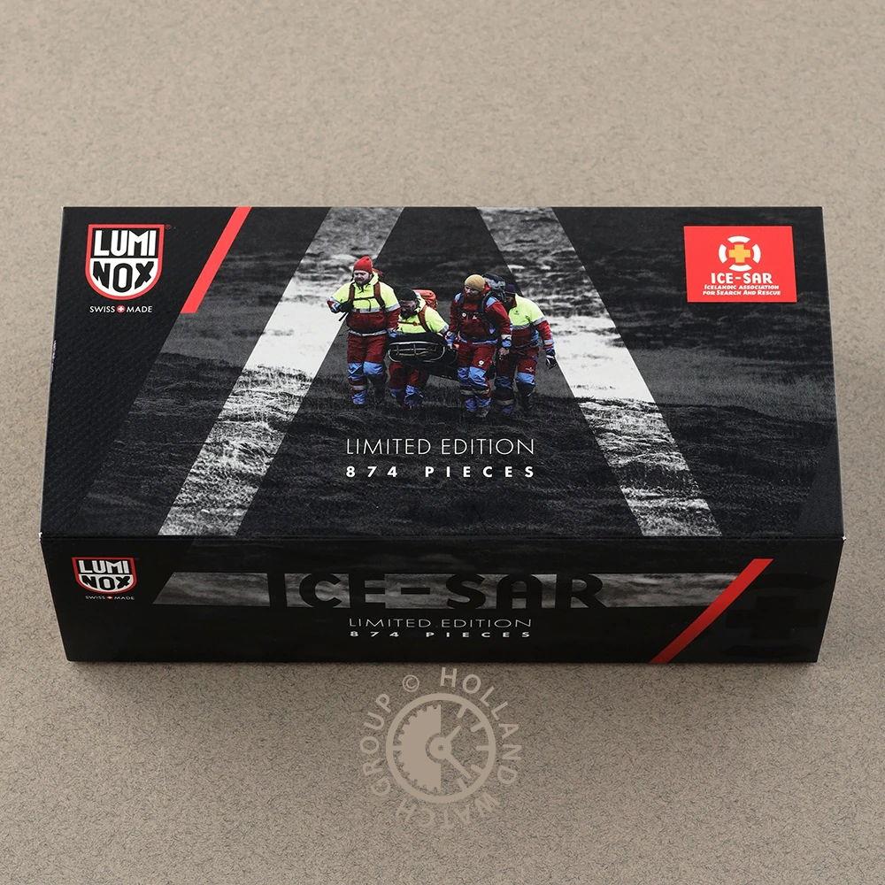 Luminox Sea Ice Sar watch model XL.1095. Limited Edition of 874 pieces. Swiss made quartz analog movement. Black CARBON case on a red silicon/textile watch strap. Uni-directional 0-60 minute bezel. Tritium gas filled tubes on the hands and markers. Black dial with red outer ring. Rated 200 meters water resistant.