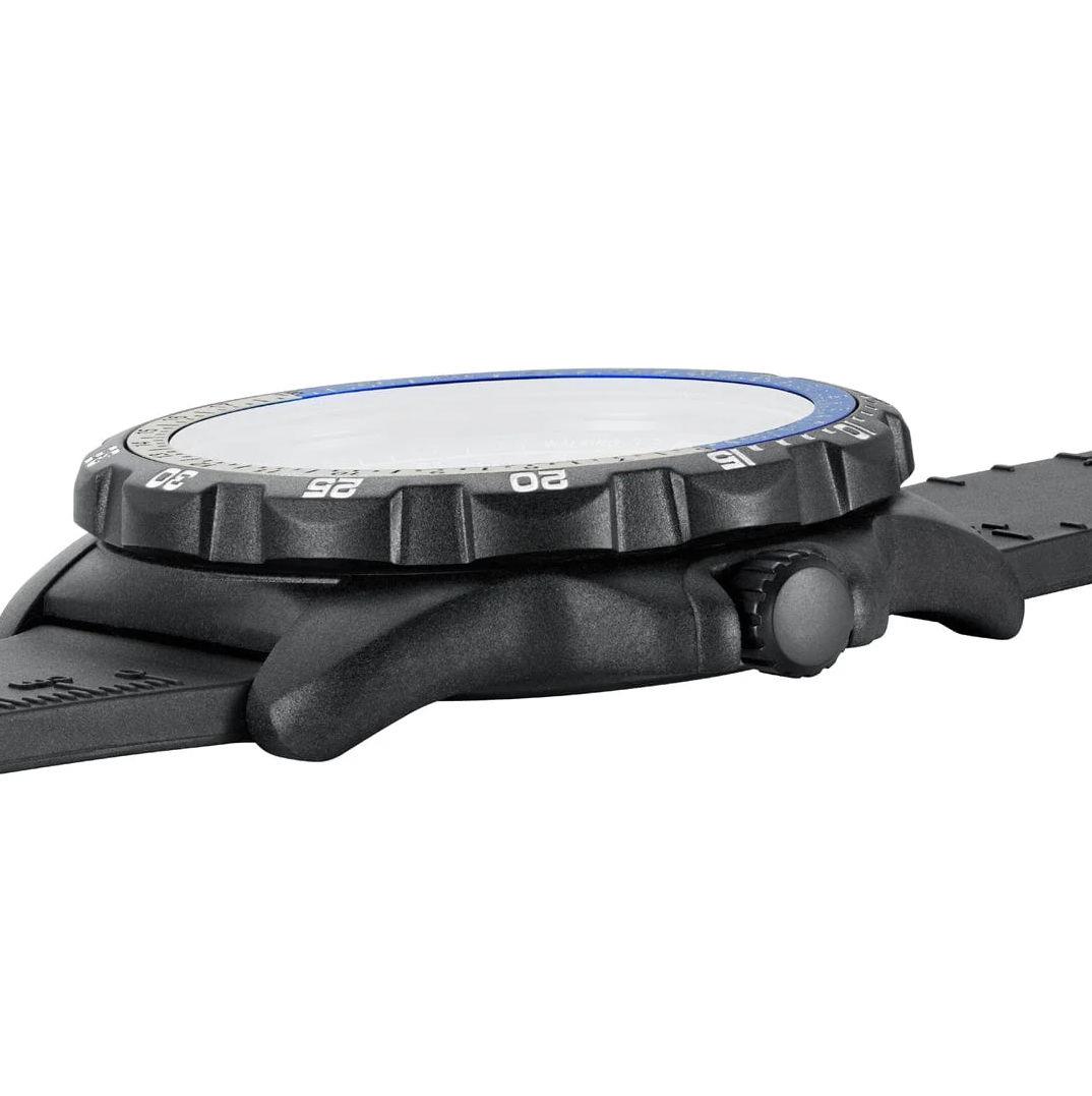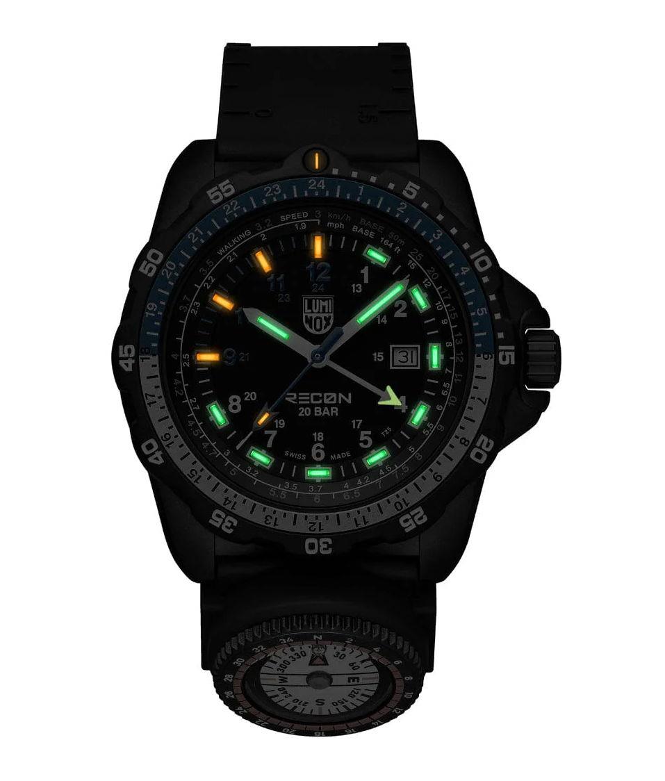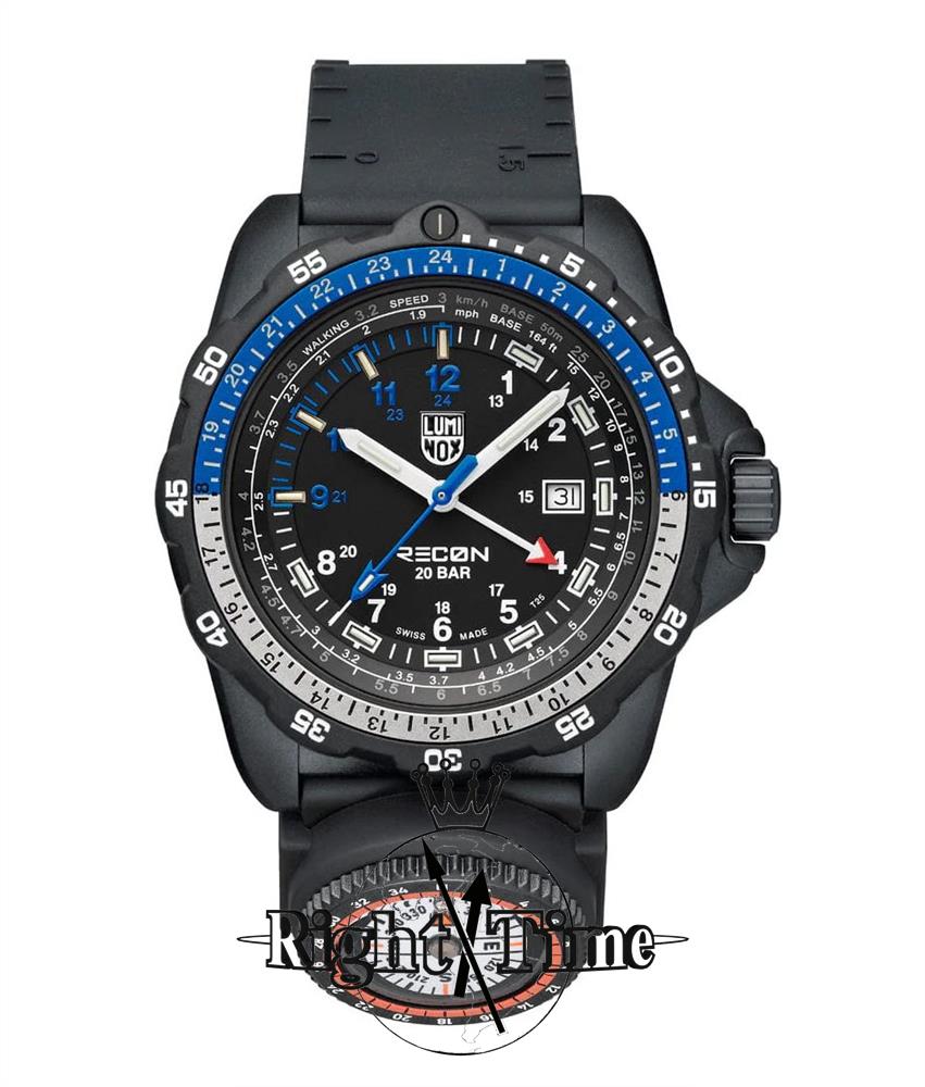 Luminox Recon Nav Spec model XL.8833. Built in collaboration with tactical specialist Andrea Micheli and is engineered for precision navigation. Powered by Swiss quartz GMT movement. Black carbon case with sapphire crystal, 24 hours scale on the bezel. Micro gas lights illuminate hands, hour markers. Black color dial with date and second time zone hand. The watch comes on a black rubber strap with integrated map scales and ruler markings, plus a detachable compass. 200 meters water resistant