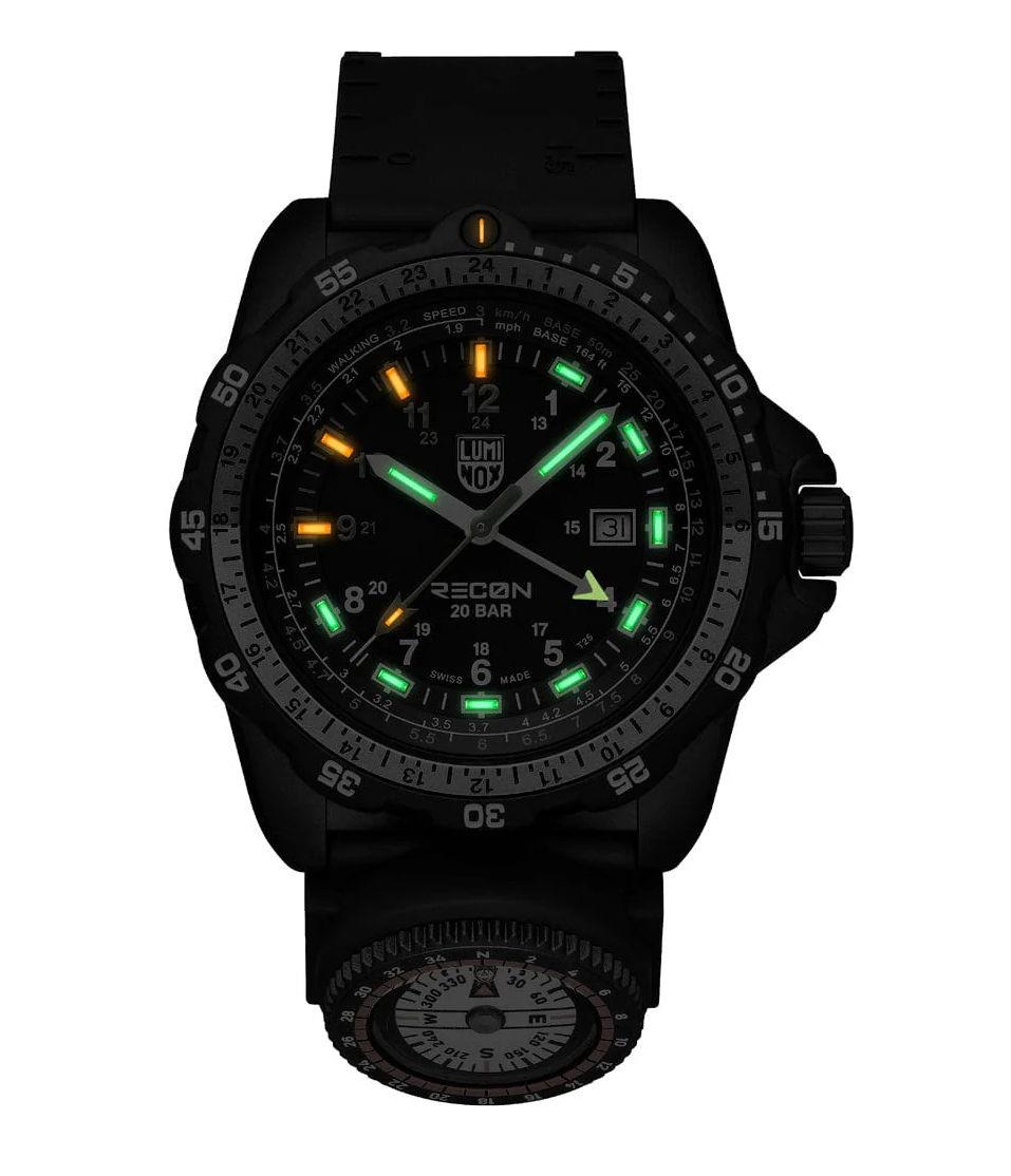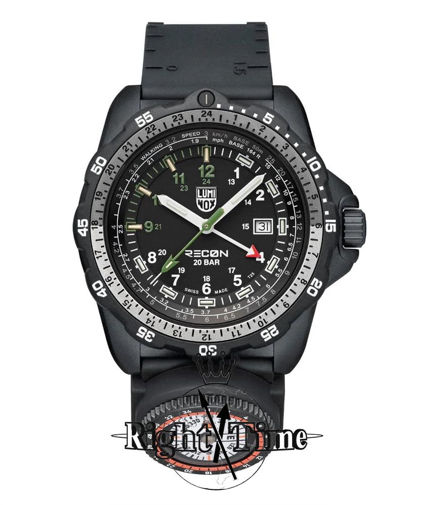 Luminox Recon Nav Spec model XL.8837.2. Built in collaboration with tactical specialist Andrea Micheli and is engineered for precision navigation. Powered by Swiss quartz GMT movement. Black carbon case with sapphire crystal, 24 hours scale on the bezel. Micro gas lights illuminate hands, hour markers. Black color dial with date and second time zone hand. The watch comes on a black rubber strap with integrated map scales and ruler markings, plus a detachable compass. 200 meters water resistant