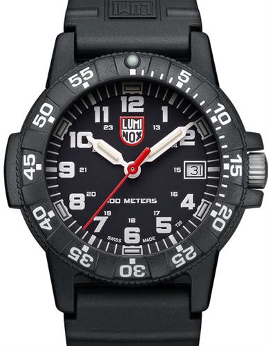 Luminox Sea Turtle 39mm sport model 0301. Black dial with easy-to-read white Arabic numerals. Micro gas tubes light the hands, 6 hour markers. The case is lightweight black color fiberglass reinforced polyester injected material. The watch comes on a polyurethane strap and is 100 meters water resistant.