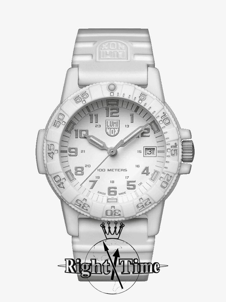 Luminox Sea Turtle 39mm model 0307.WO. Swiss quartz watch. White carbon compound case with white rubber watch strap. Uni-directional 0-60 bezel with luminous dot. Micro gas lights illuminate hands, hour markers. Flat white dial with silver Arabic numerals. 100 meters water resistant.