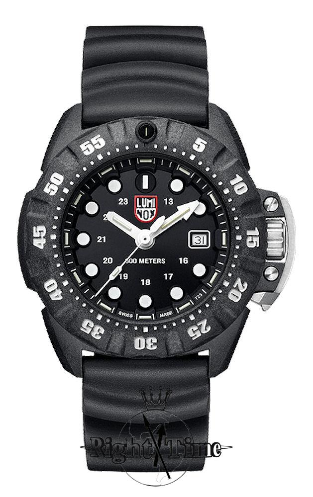 Luminox Scott Cassell Deep Dive watch model XS.1551. Quartz movement. 300m water resistant. Black CARBONOX case with stainless steel back. Black rubber band. Black dial with date