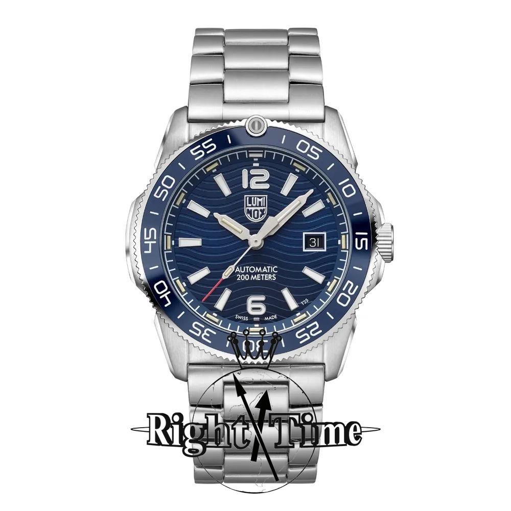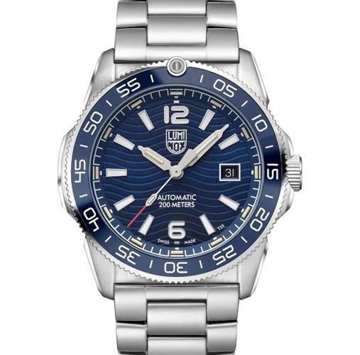 Luminox Pacific Diver Automatic 3100 Series model XS.3104. Swiss made automatic movement. Stainless steel 42mm case with bracelet. Blue wavy dial with date. Tritium gas tube filled hands and markers. Uni-directional rotating bezel with 0-60 scale. Scratch resistant sapphire crystal. Water resistant to 200 meters.