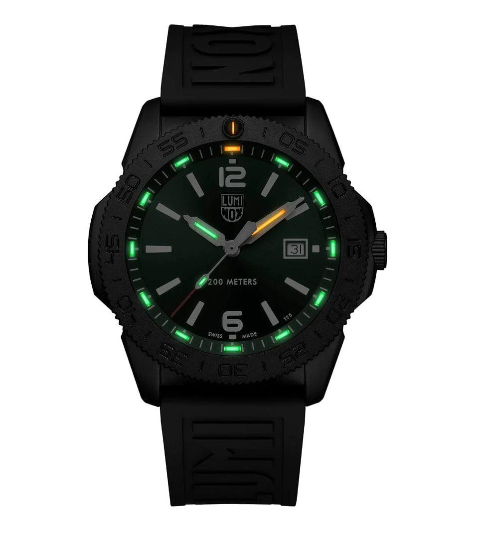 Luminox Pacific Diver model XS.3137.B. Swiss made quartz analog movement. Black IP-plated stainless steel case with CARBONOX unidirectional bezel and rubber band. Green dial. Tritium gas tube filled hands and markers. Scratch resistant sapphire crystal. Water resistant to 200 meters.