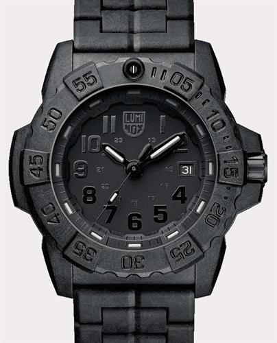Luminox EVO Navy SEAL 3500 Series dive watch. Model XS.3502.BO. Black dial with black Arabic numbers. Micro gas tubes light the hands, hour markers, and even a dot on the black unidirectional rotating bezel. The case and bracelet are made of lightweight black color carbon compound material. The watch is 200 meters water resistant.