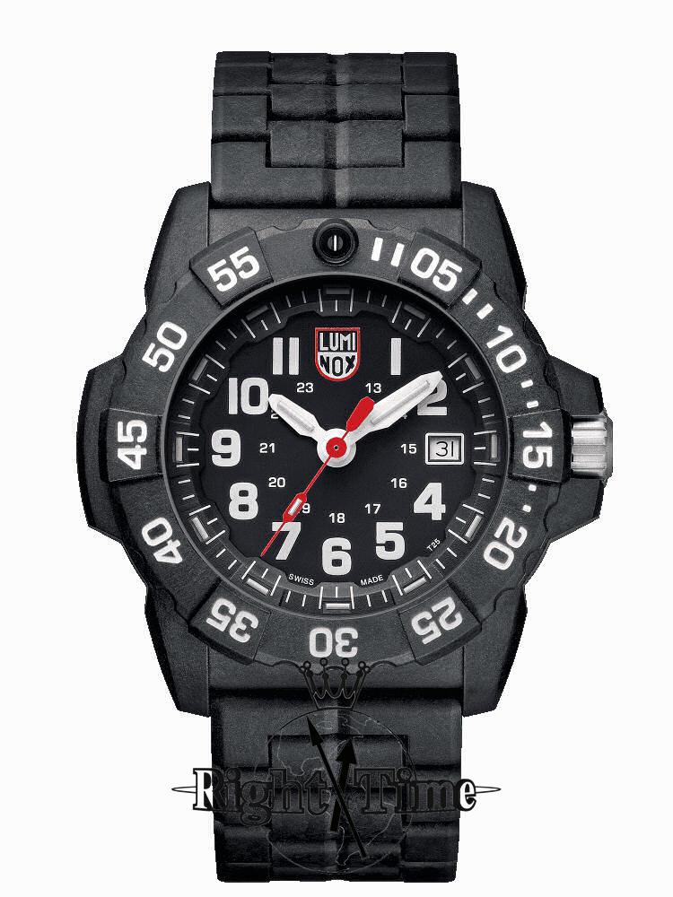 Luminox EVO Navy SEAL 3500 Series dive watch. Model XS.3502. Black dial with Arabic numbers. Micro gas tubes light the hands, hour markers, and even a dot on the black unidirectional rotating bezel. The case and bracelet are made of lightweight black color carbon compound material. The watch is 200 meters water resistant.