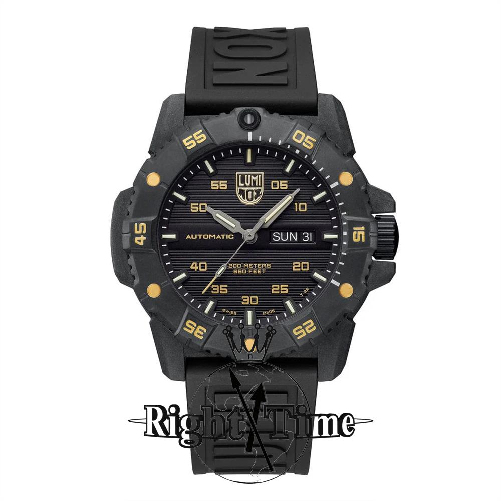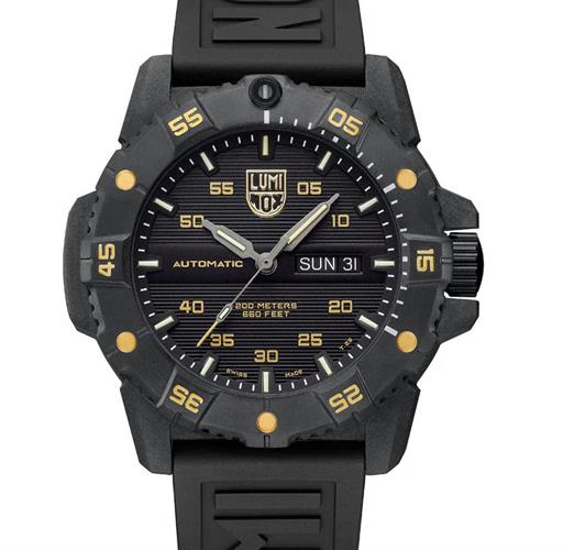 Luminox Master Carbon SEAL Automatic 45 mm, Military Dive watch model XS.3865.GOLD. Swiss SELLITA SW 220-1 automatic movement. Black CARBONOX case with black unidirectional steel ratcheting bezel. Black dial with golden numerals. Micro gas lights illuminated hour markers, hands, and dot on bezel. Sapphire crystal. Black rubber band. 660 feet water resistant