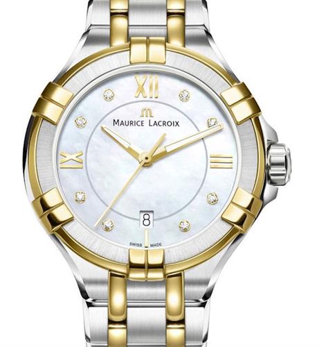 Maurice Lacroix Aikon Ladies watch model AI1004-PVY13-171-1. Swiss quartz movement. MOP dial with luminous hands, date calendar, Roman and diamond markers. Yellow gold plated accents on stainless steel case and bracelet. Sapphire crystal. Water resistant to 100 meters.