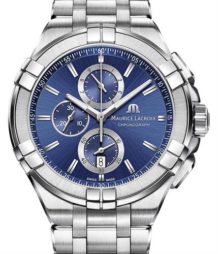 Maurice Lacroix Aikon Chronograph watch model AI1018-SS002-430-1. Swiss quartz chronograph movement. Blue color textured dial with silver sub-dials, luminous hands, and date calendar. Stainless steel case with sapphire crystal and bracelet. Water resistant to 100 meters.