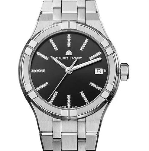 Maurice Lacroix Aikon model AI1106-SS002-350-1. Stainless steel case and bracelet. Black dial with diamond markers and date calendar. Swiss made quartz analog movement. Sapphire crystal. Water resistant to 100 meters.