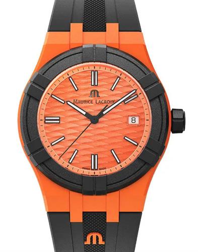Maurice Lacroix Aikon #tide watch model AI2008-50050-300-0. Swiss quartz movement. Orange textured dial with luminous hands, "vagues du Jura" finish, and date calendar. The bezel, case, case back, crown, end-piece and buckle on this new model are all made from ocean-bound upcycled plastic composite material. It takes 17 bottles to make one fabulous watch and its tailor made packaging, 100% made of #tide ocean material. Black rubber band. Water resistant to 100 meters.