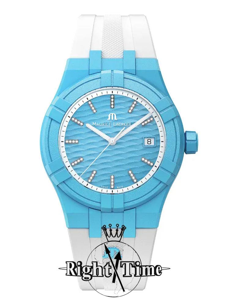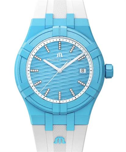 Maurice Lacroix Aikon #tide watch model AI2008-AAAA1-3A0-0. Swiss quartz movement. Light blue textured dial with diamond markers, luminous hands, "vagues du Jura" finish, and date calendar. The bezel, case, case back, crown, end-piece and buckle on this new model are all made from ocean-bound upcycled plastic composite material. It takes 17 bottles to make one fabulous watch and its tailor made packaging, 100% made of #tide ocean material. White rubber band. Water resistant to 100 meters.