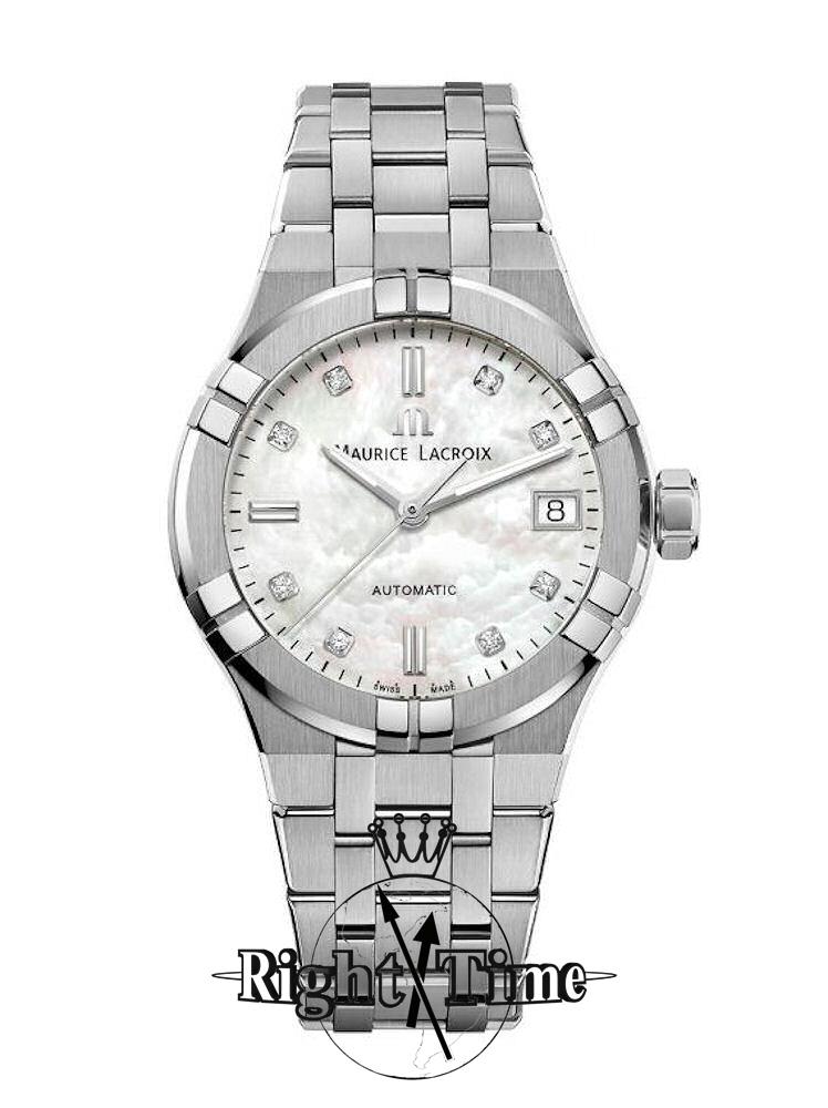 Maurice Lacroix Aikon Ladies watch model AI6006-SS002-170-1. Swiss automatic movement. White Mother-of-Pearl dial with diamond markers, luminous hands, and date calendar. Stainless steel case with sapphire crystal and bracelet. Water resistant to 200 meters.