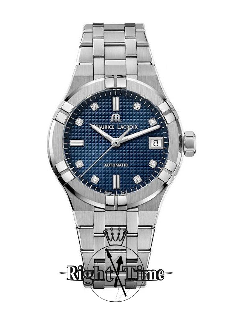 Maurice Lacroix Aikon Ladies watch model AI6006-SS002-450-1. Swiss automatic movement. Blue textured dial with diamond markers, luminous hands, and date calendar. Stainless steel case with sapphire crystal and bracelet. Water resistant to 200 meters.