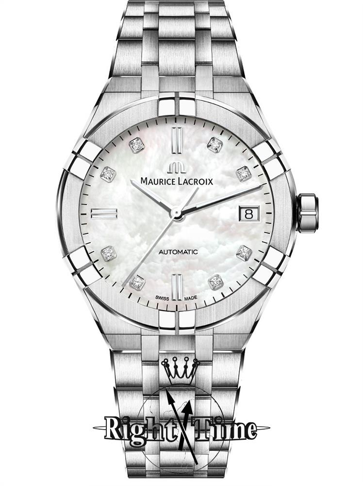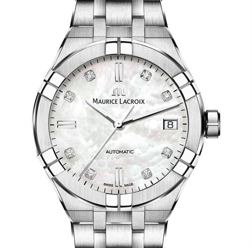 Maurice Lacroix Aikon Ladies watch model AI6007-SS002-170-1. Swiss automatic movement. White Mother-of-Pearl dial with diamond markers, luminous hands, and date calendar. 39mm stainless steel case with sapphire crystal and bracelet. Water resistant to 200 meters.