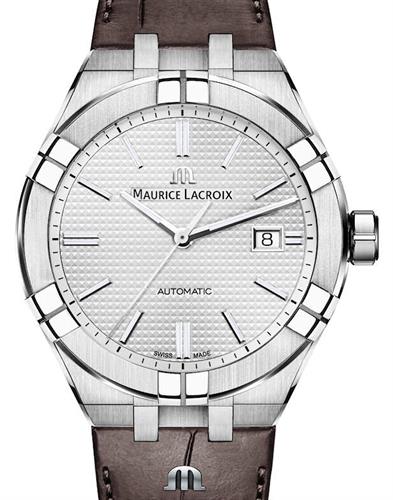 Maurice Lacroix Aikon Gents watch model AI6008-SS001-130-1. Swiss automatic movement. White textured dial with luminous hands, and date calendar. Stainless steel case with sapphire crystal and brown leather strap. Water resistant to 100 meters.