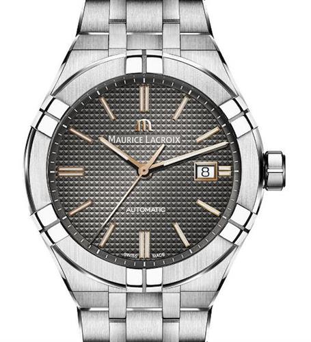 Maurice Lacroix Aikon Gents watch model AI6008-SS002-331-1. Swiss automatic movement. Black textured dial with luminous hands, rose gold tone markers, and date calendar. Stainless steel case with sapphire crystal and bracelet. Water resistant to 100 meters.