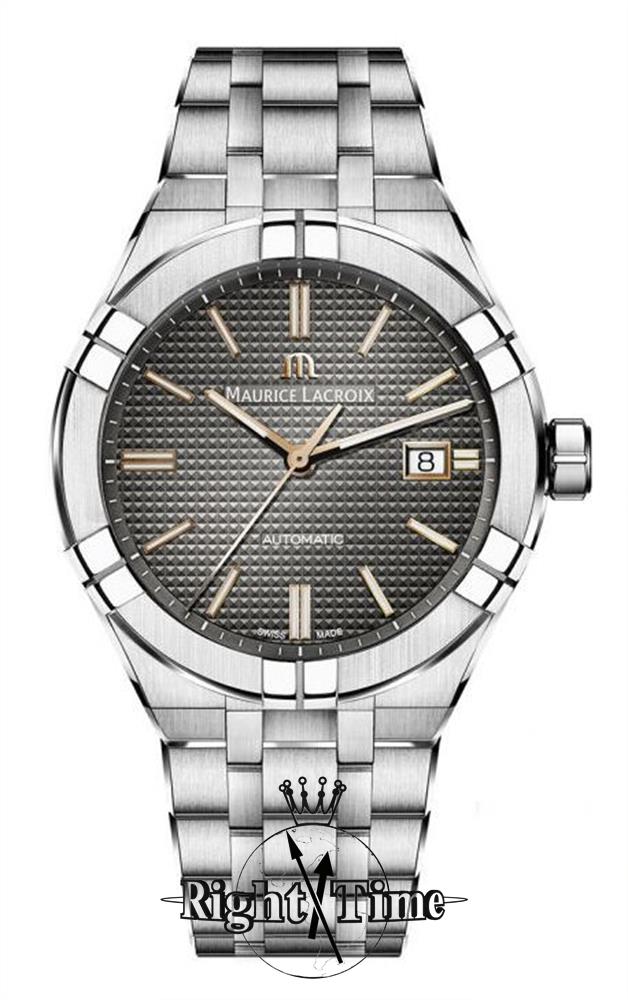 Maurice Lacroix Aikon, model AI6008-SS002-331-2. Swiss made ML115 automatic movement. Solid stainless steel case and bracelet. Textured anthracite dial with rose gold tone hands and markers. Sapphire crystal. Water resistant to 100 meters. Also includes interchangeable brown leather strap.