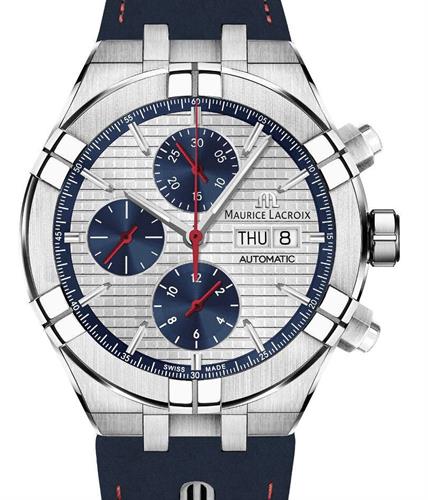 Maurice Lacroix Aikon Chronograph watch model AI6038-SS001-133-1. Swiss automatic chronograph movement. Grey color textured dial with blue sub-dials, luminous hands, and day/date calendar. Stainless steel case with sapphire crystal and blue leather band. Water resistant to 200 meters. Limited edition of 500 pieces
