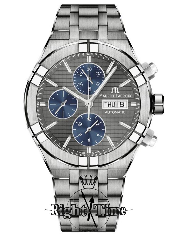 Maurice Lacroix Aikon Chronograph watch model AI6038-TT032-330-A. Swiss automatic chronograph movement. Grey color textured dial with blue sub-dials, luminous hands, and day/date calendar. Titanium case with sapphire crystal and bracelet. Water resistant to 200 meters. Comes in a set with an additional rubber band