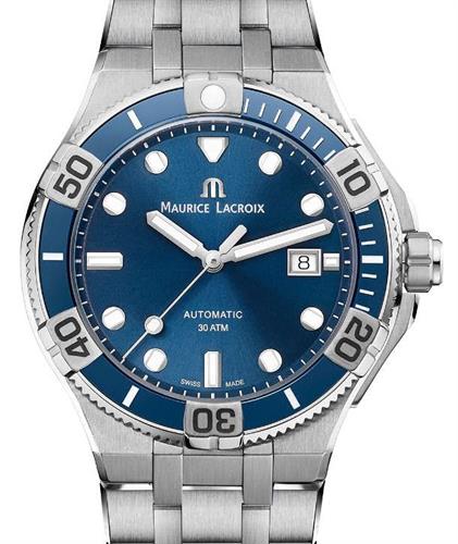 Maurice Lacroix Aikon Venturer watch model AI6058-SS002-430-1. Swiss automatic movement. Blue color textured dial, luminous hands, and date calendar. 43mm stainless steel case with sapphire crystal. Comes on steel bracelet. Water resistant to 300 meters.