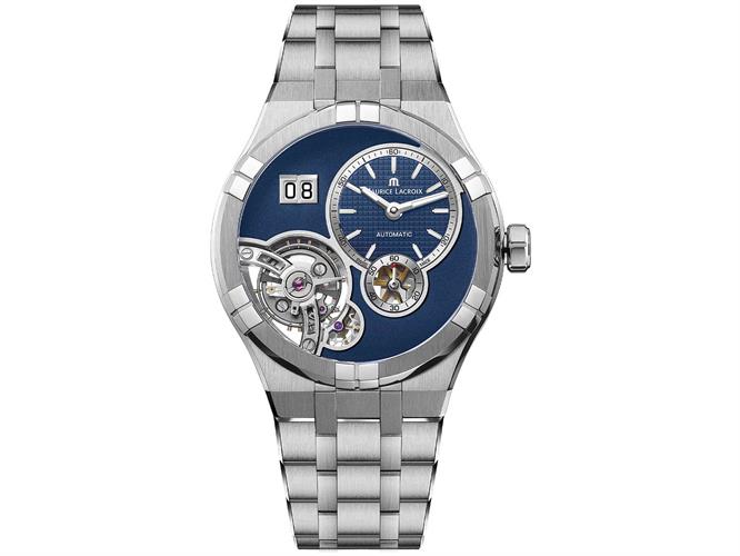 Maurice Lacroix Aikon Master Grand Date. 45mm stainless steel case. Comes with a quick release blue textile strap. Large date.