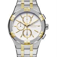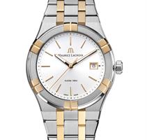 Maurice Lacroix Aikon Quartz Chronograph Duotone model AI1118-PVY03-130-1. Stainless steel case and bracelet with yellow gold tone accents. White dial with date calendar and golden sub-dials. Swiss made quartz analog movement. Sapphire crystal. Water resistant to 100 meters.