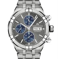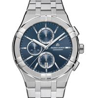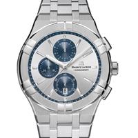 Maurice Lacroix Aikon Quartz Chronograph model AI1118-SS002-230-1. Stainless steel case and bracelet. Steel dial with date calendar and blue sub-dials. Swiss made quartz analog movement. Sapphire crystal. Water resistant to 100 meters.