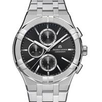 Maurice Lacroix Aikon Quartz Chronograph model AI1118-SS002-330-1. Stainless steel case and bracelet. Black dial with date calendar and silver sub-dials. Swiss made quartz analog movement. Sapphire crystal. Water resistant to 100 meters.