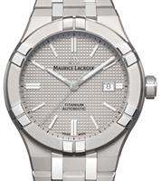 Maurice Lacroix Aikon Chronograph watch model AI6038-TT032-330-A. Swiss automatic chronograph movement. Grey color textured dial with blue sub-dials, luminous hands, and day/date calendar. Titanium case with sapphire crystal and bracelet. Water resistant to 200 meters. Comes in a set with an additional rubber band