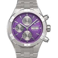 Maurice Lacroix Aikon Chronograph watch model AI6038-TT032-430-1. Swiss automatic chronograph movement. Purple color textured dial with grey sub-dials, luminous hands, and day/date calendar. Titanium case with sapphire crystal and bracelet. Water resistant to 200 meters.