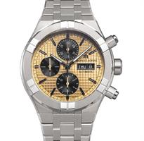 Maurice Lacroix Aikon Chronograph watch mode AI6038-TT032-530-1. Swiss automatic chronograph movement. Gold color textured dial with black sub-dials, luminous hands, and day/date calendar. Titanium case with sapphire crystal and bracelet. Water resistant to 200 meters.