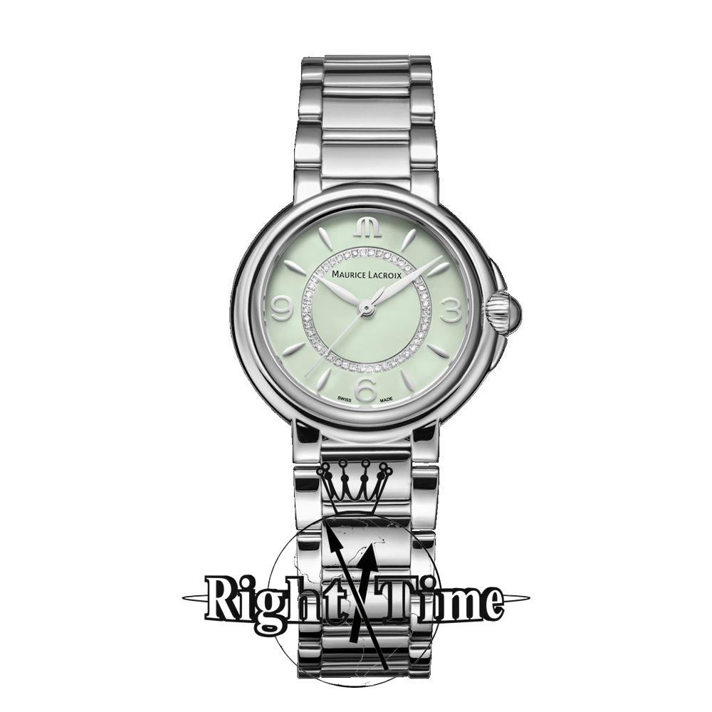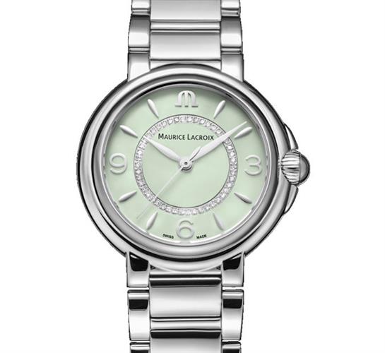 Maurice Lacroix Fiaba Colours Edition model FA1104-SS002-G20-1. Stainless steel case and bracelet. Mint green dial with diamond ring. Swiss made quartz analog movement. Sapphire crystal. Water resistant to 50 meters.