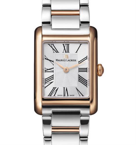 Maurice Lacroix Fiaba - slim and feminine, fashionable and contemporary with a touch of classic. Ergonomically designed rectangular shaped rose gold plated stainless steel case with sapphire crystal. Swiss ETA quartz movement. Silver color textured dial with Roman numerals. Stainless steel bracelet with rose gold accents.