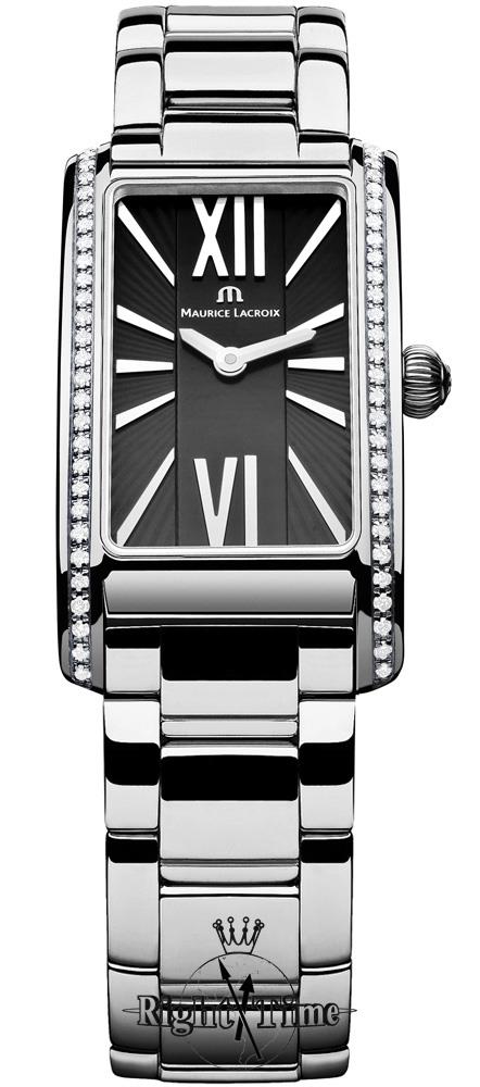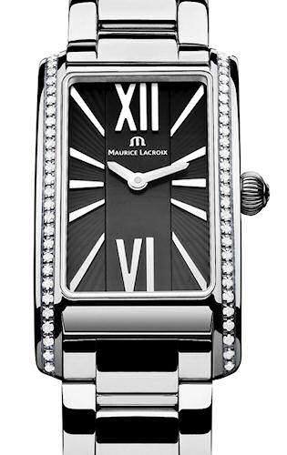 Maurice Lacroix Fiaba - slim and feminine, fashionable and contemporary with a touch of classic. Ergonomically designed rectangular shaped stainless steel case with diamonds and sapphire crystal. Swiss ETA quartz movement. Black dial with Roman numerals. Stainless steel bracelet.