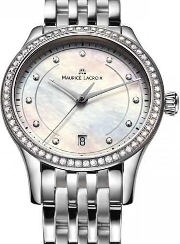 Maurice Lacroix Les Classiques Date Ladies 33mm watch model LC1026-SD502-170. Swiss quartz movement. Mother-of-Pearl textured dial with diamond markers, and date calendar. Polish finished case with diamond bezel and sapphire crystal. Stainless steel bracelet