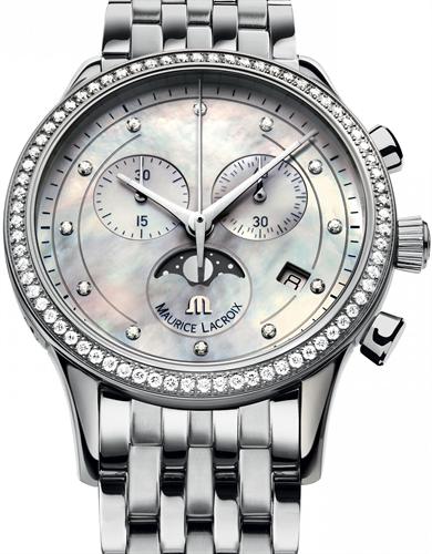 Maurice Lacroix Les Classiques Phases de Lune Chronographe model LC1087-SD502-160. Swiss quartz chronograph movement. Mother-of-Pearl textured dial with diamond markers, date and moon-phase calendar. Polish finished case with diamond bezel, and sapphire crystal. Stainless steel bracelet