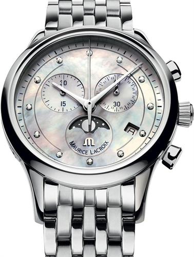 Maurice Lacroix Les Classiques Phases de Lune Chronographe model LC1087-SS002-160. Swiss quartz chronograph movement. Mother-of-Pearl textured dial with diamond markers, date and moon-phase calendar. Polish finished case with sapphire crystal. Stainless steel bracelet